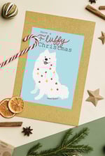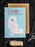 Carte de vœux de Noël pliée afin d’écrire à l’intérieur. Représente un chien samoyède couvert de boules de Noël.