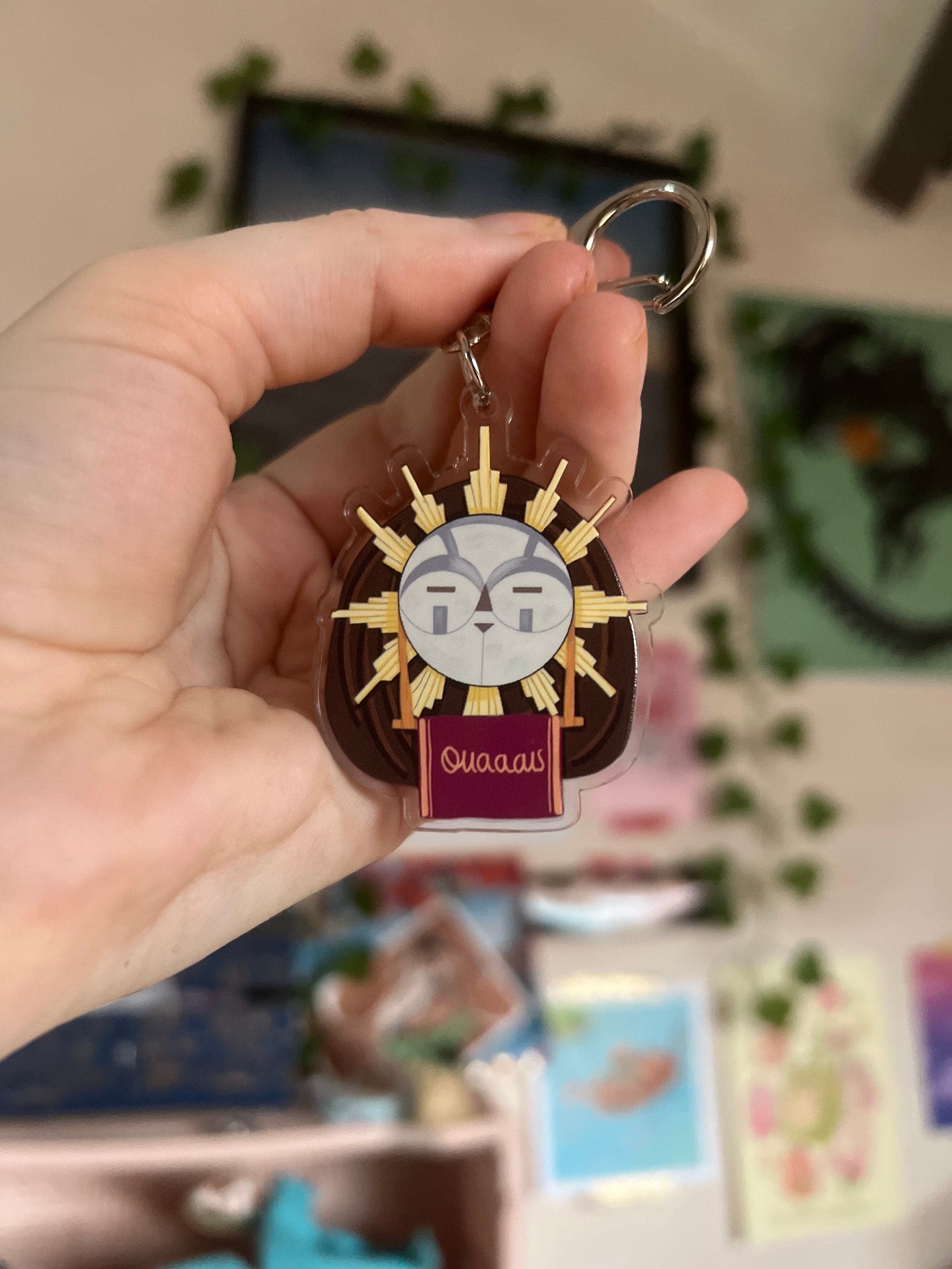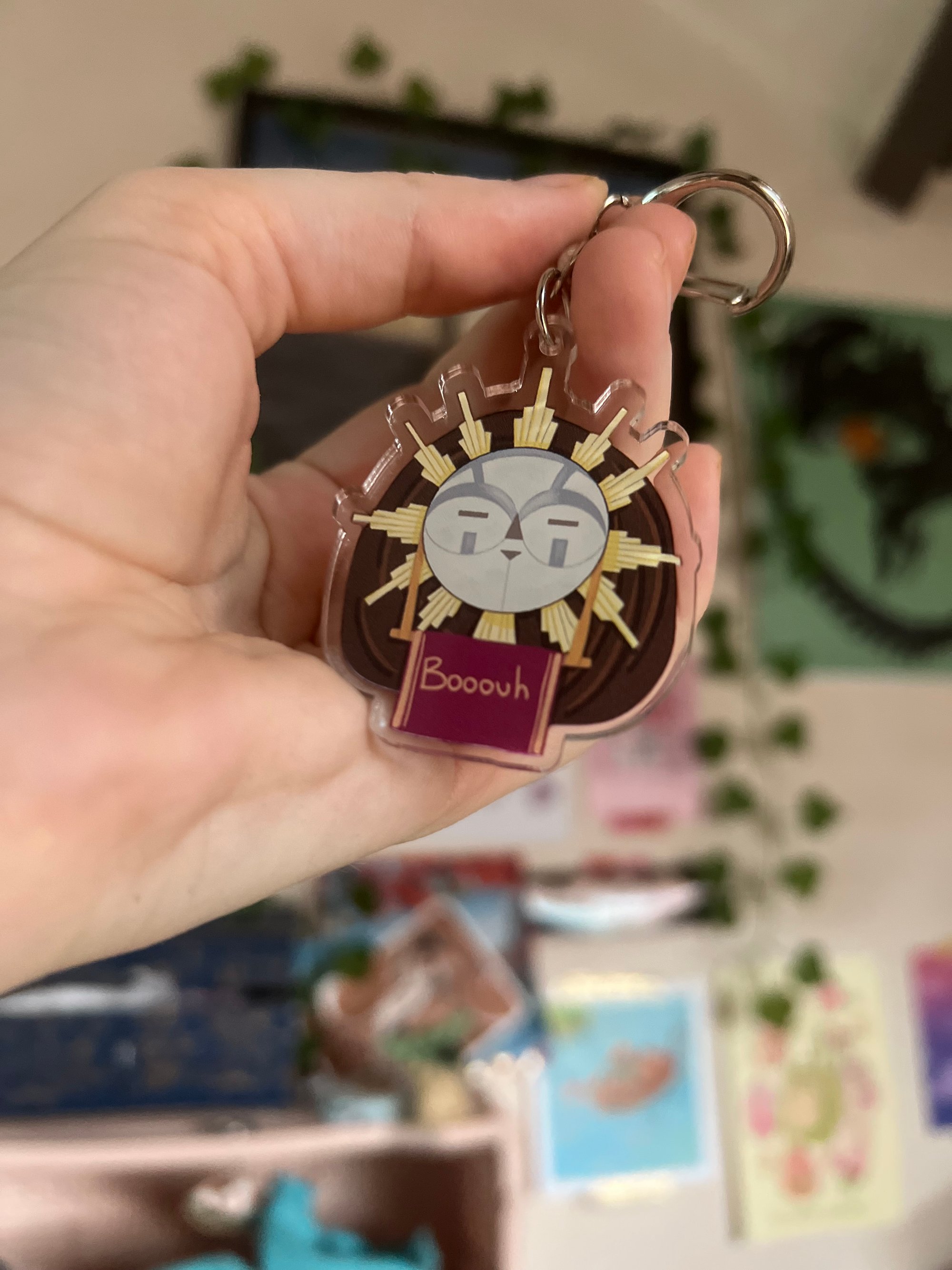 Porte clé représentant Esquie du jeu Clair Obscur Expédition 33 et ses deux humeurs: Bouuuh et Ouaaaais, chacune sur une face.